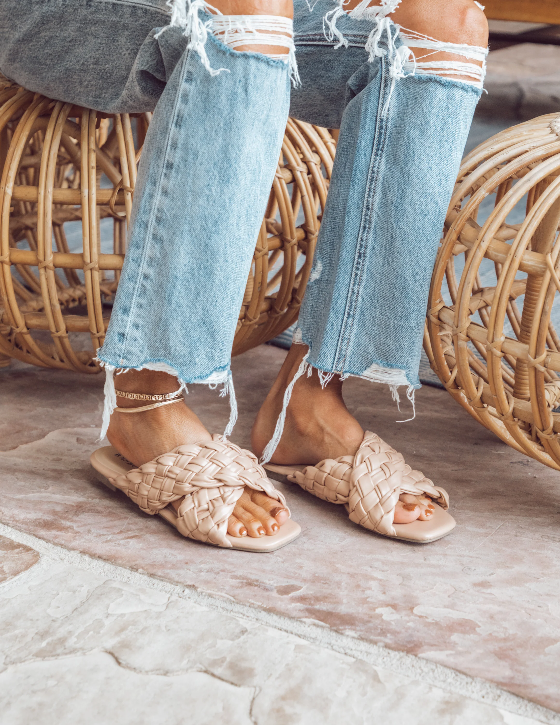 Braided criss cross strap over top of foot with half inch platform. Open toe and heel.