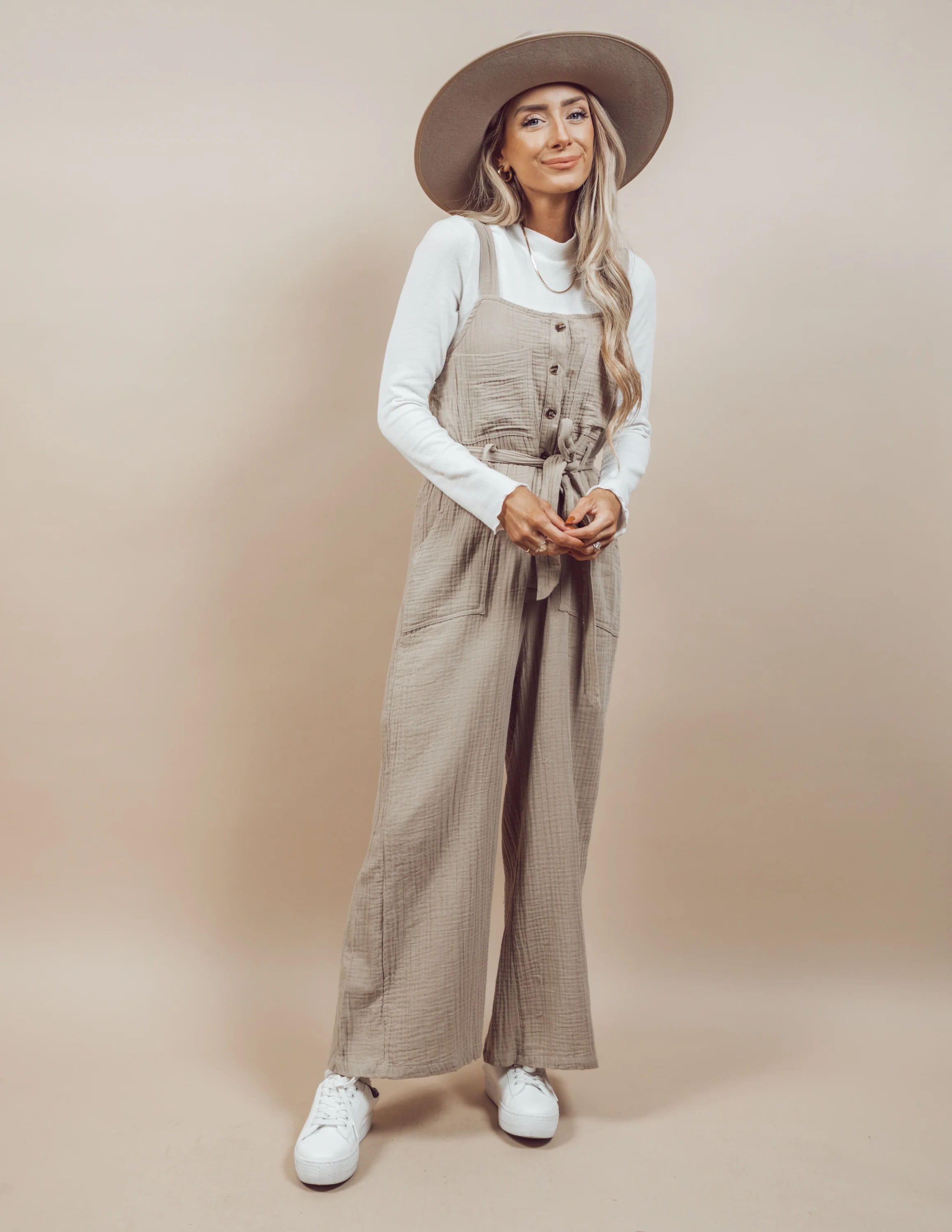 *jumpsuit with partial button-up (nursing friendly) and nonadjustable straps, upper chest pocket and side pockets, belt at waist, wide leg, lined